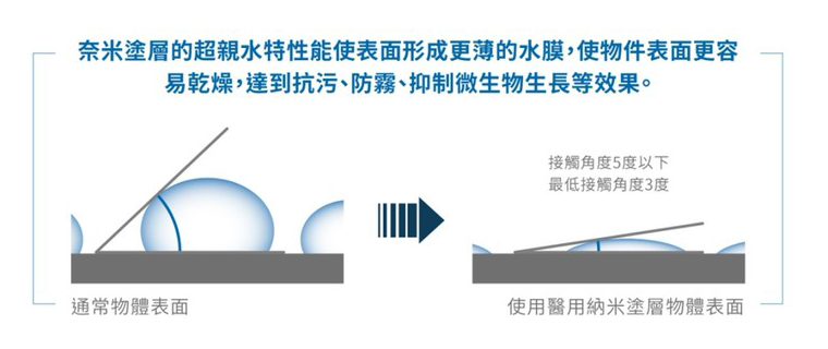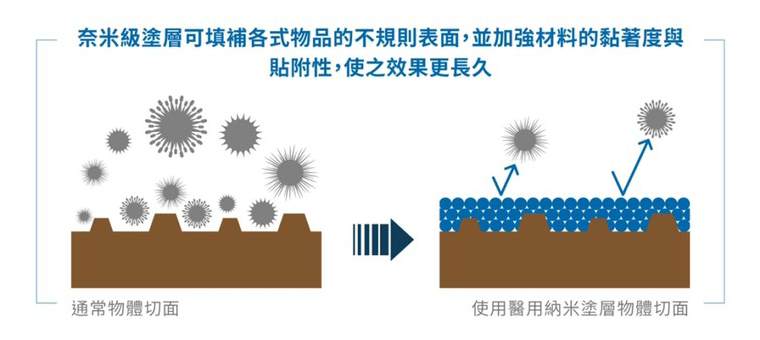 奈米塗層是一種特殊的塗層奈米塗層劑,通過將其塗在物體表面來破壞細菌和病毒並抑制黴菌的生長。 獨特的無機奈米材料,如具有單一奈米顆粒尺寸(1 至 10 奈米)的矽和鉑,覆蓋著看不見的微米和奈米級不規則結構,以賦予抗病毒、抗真菌和抗病毒性能。 此外,塗層表面還具有抗靜電功能,可防止微生物、細小灰塵和污垢粘附在其上。此外,當塗上Medical Nanocoat時,塗層表面變得超親水,創造了一個乾淨的環境,水滴和污垢不生長,黴菌和微生物不能生長,效果持久。